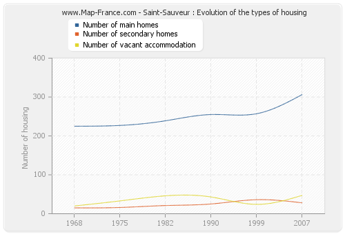 The number of housing of Saint-Sauveur was 381 in 2007, 317 in 1999, 323 in 1990, 306 in 1982, 276 in 1975 and 260 in 1968.