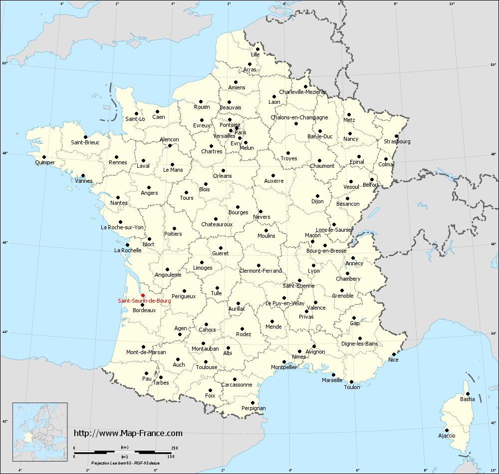 Map of Saint-Seurin-de-Bourg with regions and prefectures
