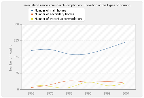 The following graphs show the history of the number and the type of housing of Saint-Symphorien from 1968 to 2007. The second graph is drawn in cubic interpolation. This allows to obtain more exactly the number of accommodation of the town of Saint-Symphorien years where no inventory was made.