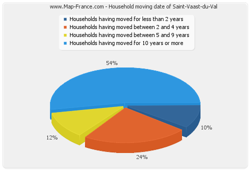 - Number of households of Saint-Vaast-du-Val having moved between 2 and 5 years : 32 - Number of households of Saint-Vaast-du-Val having moved between 5 and 9 years : 16 - Number of households of Saint-Vaast-du-Val having moved for 10 years or more : 72 |