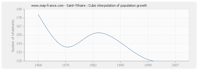 This curve shows the history of the population of Saint-Ythaire from 1968 to 2007 in cubic interpolation. This provides more precisely the population of the municipality of Saint-Ythaire the years where no census has been taken.