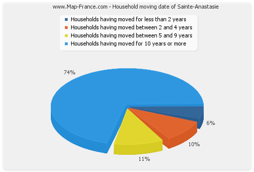 - Number of households of Sainte-Anastasie having moved between 2 and 5 years : 7 - Number of households of Sainte-Anastasie having moved between 5 and 9 years : 8 - Number of households of Sainte-Anastasie having moved for 10 years or more : 53 |
