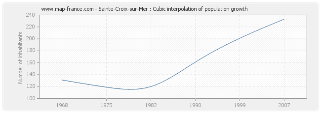 This curve shows the history of the population of Sainte-Croix-sur-Mer from 1968 to 2007 in cubic interpolation. This provides more precisely the population of the municipality of Sainte-Croix-sur-Mer the years where no census has been taken.