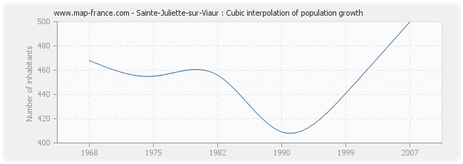 This curve shows the history of the population of Sainte-Juliette-sur-Viaur from 1968 to 2007 in cubic interpolation. This provides more precisely the population of the municipality of Sainte-Juliette-sur-Viaur the years where no census has been taken.