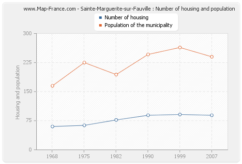 The population of Sainte-Marguerite-sur-Fauville was 240 inhabitants in 2007, 264 inhabitants in 1999, 246 inhabitants in 1990, 194 inhabitants in 1982, 225 inhabitants in 1975 and 165 inhabitants in 1968. Meanwhile, the number of housing of Sainte-Marguerite-sur-Fauville was 89 in 2007, 91 in 1999, 89 in 1990, 77 in 1982, 63 in 1975 and 60 in 1968.