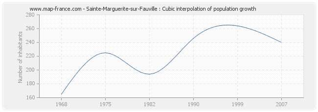 This curve shows the history of the population of Sainte-Marguerite-sur-Fauville from 1968 to 2007 in cubic interpolation. This provides more precisely the population of the municipality of Sainte-Marguerite-sur-Fauville the years where no census has been taken.