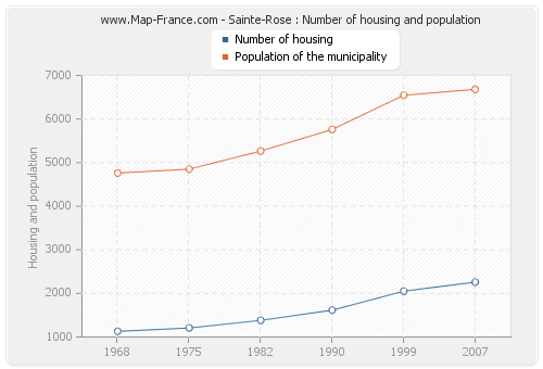 The population of Sainte-Rose was 6 680 inhabitants in 2007, 6 545 inhabitants in 1999, 5 761 inhabitants in 1990, 5 265 inhabitants in 1982, 4 850 inhabitants in 1975 and 4 761 inhabitants in 1968. Meanwhile, the number of housing of Sainte-Rose was 2 259 in 2007, 2 050 in 1999, 1 615 in 1990, 1 381 in 1982, 1 206 in 1975 and 1 129 in 1968.