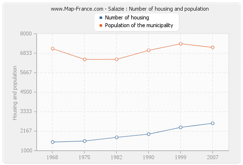 The population of Salazie was 7 181 inhabitants in 2007, 7 400 inhabitants in 1999, 7 004 inhabitants in 1990, 6 467 inhabitants in 1982, 6 462 inhabitants in 1975 and 7 105 inhabitants in 1968. Meanwhile, the number of housing of Salazie was 2 640 in 2007, 2 396 in 1999, 1 990 in 1990, 1 798 in 1982, 1 579 in 1975 and 1 517 in 1968.