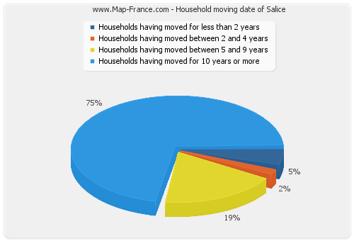 - Number of households of Salice having moved between 2 and 5 years : 1 - Number of households of Salice having moved between 5 and 9 years : 11 - Number of households of Salice having moved for 10 years or more : 44 |