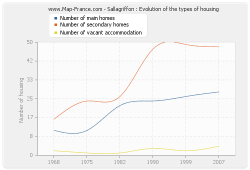 The following graphs show the history of the number and the type of housing of Sallagriffon from 1968 to 2007. The second graph is drawn in cubic interpolation. This allows to obtain more exactly the number of accommodation of the town of Sallagriffon years where no inventory was made.