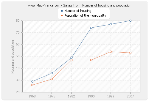 The population of Sallagriffon was 53 inhabitants in 2007, 54 inhabitants in 1999, 47 inhabitants in 1990, 47 inhabitants in 1982, 31 inhabitants in 1975 and 26 inhabitants in 1968. Meanwhile, the number of housing of Sallagriffon was 80 in 2007, 77 in 1999, 74 in 1990, 49 in 1982, 36 in 1975 and 29 in 1968.