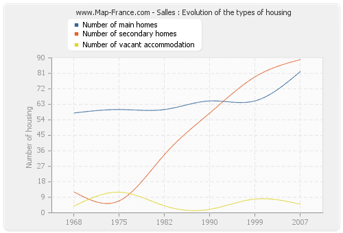 The following graphs show the history of the number and the type of housing of Salles from 1968 to 2007. The second graph is drawn in cubic interpolation. This allows to obtain more exactly the number of accommodation of the town of Salles years where no inventory was made.