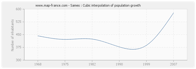 This curve shows the history of the population of Sames from 1968 to 2007 in cubic interpolation. This provides more precisely the population of the municipality of Sames the years where no census has been taken.