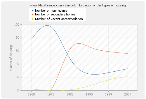 The number of housing of Sampolo was 110 in 2007, 102 in 1999, 98 in 1990, 112 in 1982, 97 in 1975 and 80 in 1968.