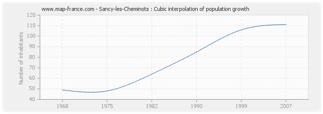 This curve shows the history of the population of Sancy-les-Cheminots from 1968 to 2007 in cubic interpolation. This provides more precisely the population of the municipality of Sancy-les-Cheminots the years where no census has been taken.