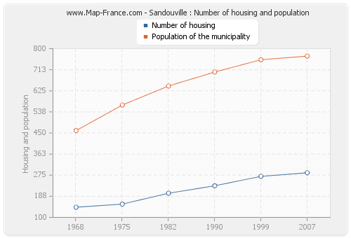 The population of Sandouville was 769 inhabitants in 2007, 754 inhabitants in 1999, 703 inhabitants in 1990, 645 inhabitants in 1982, 566 inhabitants in 1975 and 460 inhabitants in 1968. Meanwhile, the number of housing of Sandouville was 285 in 2007, 270 in 1999, 231 in 1990, 200 in 1982, 155 in 1975 and 142 in 1968.
