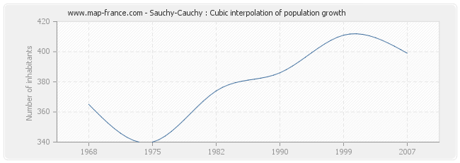 This curve shows the history of the population of Sauchy-Cauchy from 1968 to 2007 in cubic interpolation. This provides more precisely the population of the municipality of Sauchy-Cauchy the years where no census has been taken.