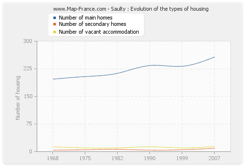The following graphs show the history of the number and the type of housing of Saulty from 1968 to 2007. The second graph is drawn in cubic interpolation. This allows to obtain more exactly the number of accommodation of the town of Saulty years where no inventory was made.