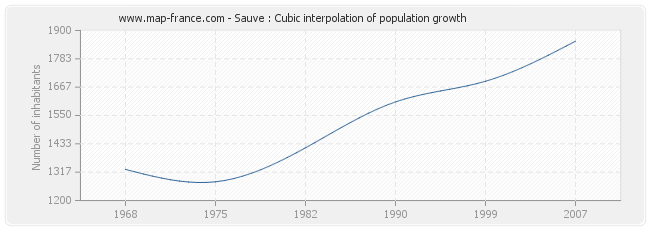 This curve shows the history of the population of Sauve from 1968 to 2007 in cubic interpolation. This provides more precisely the population of the municipality of Sauve the years where no census has been taken.