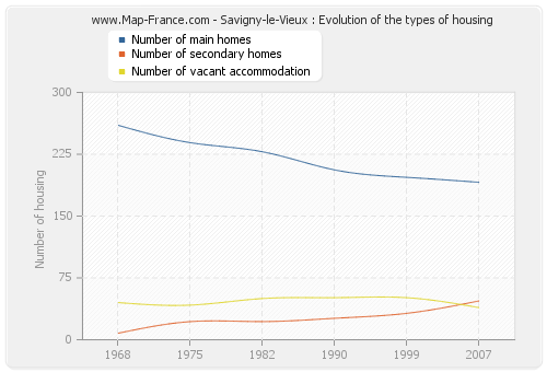 The following graphs show the history of the number and the type of housing of Savigny-le-Vieux from 1968 to 2007. The second graph is drawn in cubic interpolation. This allows to obtain more exactly the number of accommodation of the town of Savigny-le-Vieux years where no inventory was made.