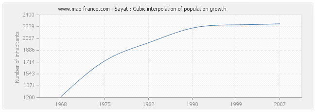 This curve shows the history of the population of Sayat from 1968 to 2007 in cubic interpolation. This provides more precisely the population of the municipality of Sayat the years where no census has been taken.