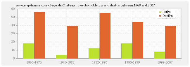 Ségur-le-Château : evolution of births and deaths from 1968 to 2007