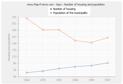 The population of Sepx was 165 inhabitants in 2007, 152 inhabitants in 1999, 157 inhabitants in 1990, 186 inhabitants in 1982, 186 inhabitants in 1975 and 217 inhabitants in 1968. Meanwhile, the number of housing of Sepx was 97 in 2007, 90 in 1999, 87 in 1990, 82 in 1982, 75 in 1975 and 71 in 1968.
