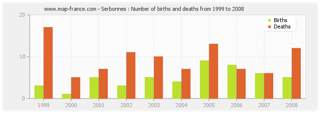 - Serbonnes in 2008 : 5 births and 12 deaths
