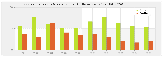 Sermaise : evolution of births and deaths from 1968 to 2007