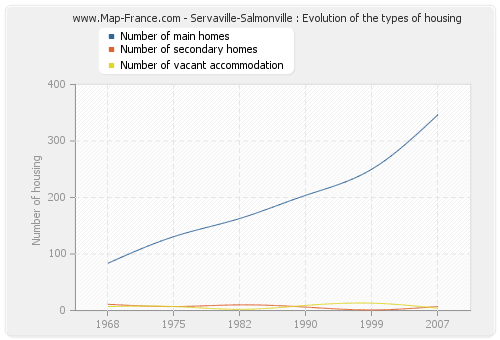 The following graphs show the history of the number and the type of housing of Servaville-Salmonville from 1968 to 2007. The second graph is drawn in cubic interpolation. This allows to obtain more exactly the number of accommodation of the town of Servaville-Salmonville years where no inventory was made.