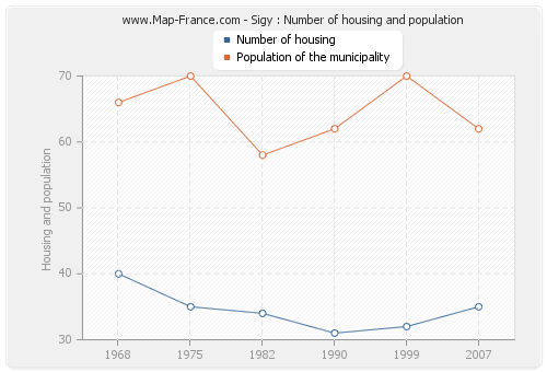 The population of Sigy was 62 inhabitants in 2007, 70 inhabitants in 1999, 62 inhabitants in 1990, 58 inhabitants in 1982, 70 inhabitants in 1975 and 66 inhabitants in 1968. Meanwhile, the number of housing of Sigy was 35 in 2007, 32 in 1999, 31 in 1990, 34 in 1982, 35 in 1975 and 40 in 1968.