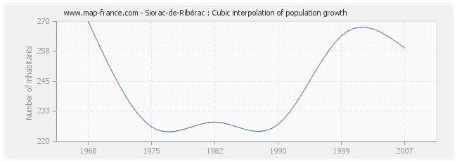 Population of Siorac-de-Ribérac was 259 inhabitants in 2007, 264 inhabitants in 1999, 227 inhabitants in 1990, 228 inhabitants in 1982, 226 inhabitants in 1975 and 270 inhabitants in 1968.