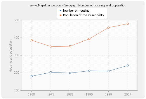 The population of Sologny was 480 inhabitants in 2007, 458 inhabitants in 1999, 394 inhabitants in 1990, 352 inhabitants in 1982, 350 inhabitants in 1975 and 386 inhabitants in 1968. Meanwhile, the number of housing of Sologny was 242 in 2007, 210 in 1999, 212 in 1990, 199 in 1982, 203 in 1975 and 181 in 1968.