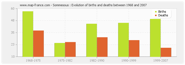 Sommesous : evolution of births and deaths from 1968 to 2007