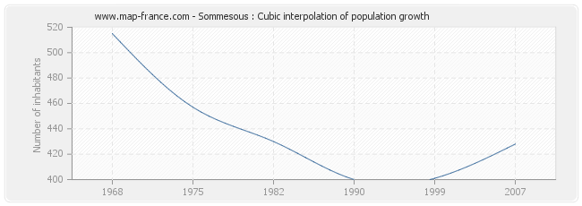 This curve shows the history of the population of Sommesous from 1968 to 2007 in cubic interpolation. This provides more precisely the population of the municipality of Sommesous the years where no census has been taken.