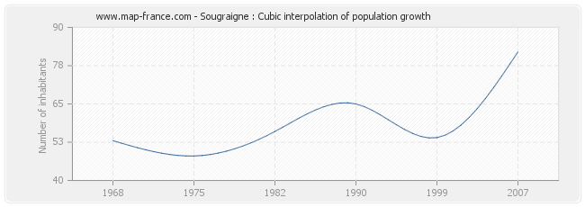 This curve shows the history of the population of Sougraigne from 1968 to 2007 in cubic interpolation. This provides more precisely the population of the municipality of Sougraigne the years where no census has been taken.