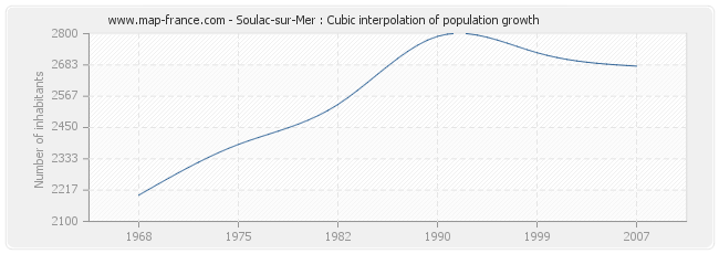 This curve shows the history of the population of Soulac-sur-Mer from 1968 to 2007 in cubic interpolation. This provides more precisely the population of the municipality of Soulac-sur-Mer the years where no census has been taken.