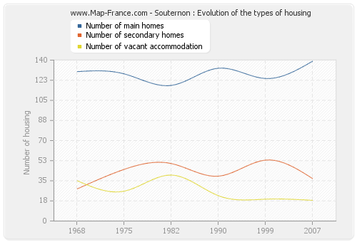 The following graphs show the history of the number and the type of housing of Souternon from 1968 to 2007. The second graph is drawn in cubic interpolation. This allows to obtain more exactly the number of accommodation of the town of Souternon years where no inventory was made.