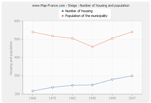 The population of Steige was 541 inhabitants in 2007, 505 inhabitants in 1999, 459 inhabitants in 1990, 505 inhabitants in 1982, 518 inhabitants in 1975 and 540 inhabitants in 1968. Meanwhile, the number of housing of Steige was 300 in 2007, 280 in 1999, 250 in 1990, 248 in 1982, 237 in 1975 and 217 in 1968.