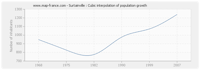 This curve shows the history of the population of Surtainville from 1968 to 2007 in cubic interpolation. This provides more precisely the population of the municipality of Surtainville the years where no census has been taken.