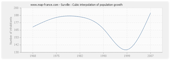 This curve shows the history of the population of Surville from 1968 to 2007 in cubic interpolation. This provides more precisely the population of the municipality of Surville the years where no census has been taken.