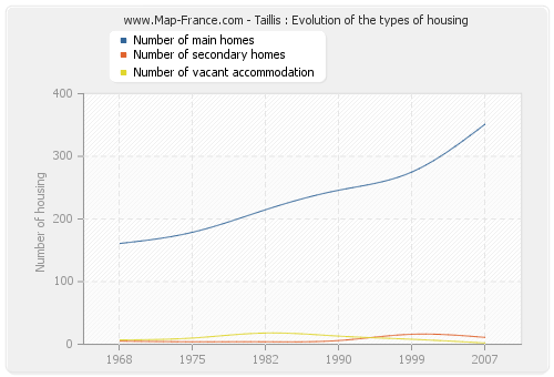 The following graphs show the history of the number and the type of housing of Taillis from 1968 to 2007. The second graph is drawn in cubic interpolation. This allows to obtain more exactly the number of accommodation of the town of Taillis years where no inventory was made.