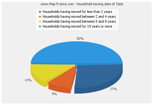 - Number of households of Taizé having moved between 2 and 5 years : 2 - Number of households of Taizé having moved between 5 and 9 years : 3 - Number of households of Taizé having moved for 10 years or more : 11 |