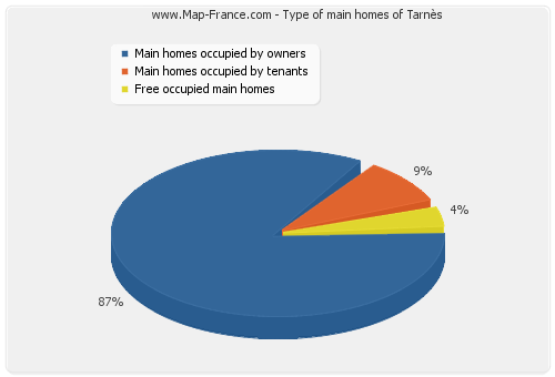 - Number of main homes of Tarnès occupied by owners : 86 - Number of main homes of Tarnès occupied by tenants : 9 - Number of main homes of Tarnès occupied free of charge : 4 |