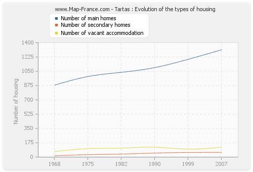 The number of housing of Tartas was 1 490 in 2007, 1 350 in 1999, 1 266 in 1990, 1 185 in 1982, 1 120 in 1975 and 966 in 1968.