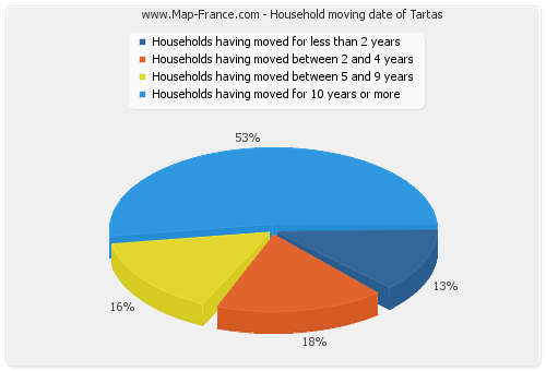 - Number of households of Tartas having moved between 2 and 5 years : 230 - Number of households of Tartas having moved between 5 and 9 years : 211 - Number of households of Tartas having moved for 10 years or more : 698 |