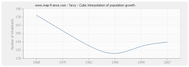 This curve shows the history of the population of Tarzy from 1968 to 2007 in cubic interpolation. This provides more precisely the population of the municipality of Tarzy the years where no census has been taken.