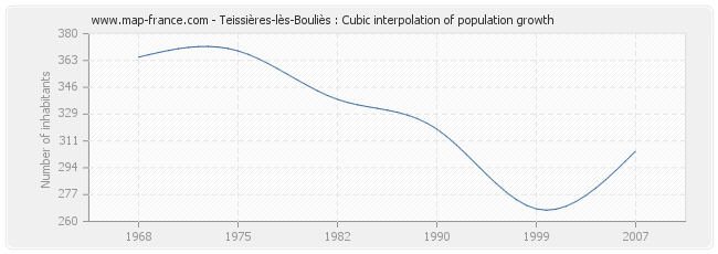 This curve shows the history of the population of Teissières-lès-Bouliès from 1968 to 2007 in cubic interpolation. This provides more precisely the population of the municipality of Teissières-lès-Bouliès the years where no census has been taken.
