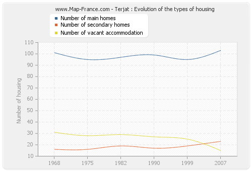 The following graphs show the history of the number and the type of housing of Terjat from 1968 to 2007. The second graph is drawn in cubic interpolation. This allows to obtain more exactly the number of accommodation of the town of Terjat years where no inventory was made.