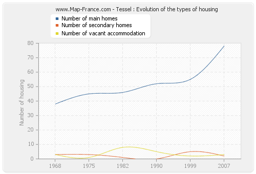 The number of housing of Tessel was 84 in 2007, 62 in 1999, 57 in 1990, 55 in 1982, 49 in 1975 and 44 in 1968.